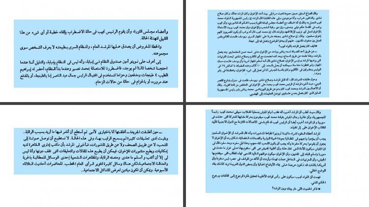 - Photos des témoignages des dirigeants de l’organisation armée secrète des Frères musulmans en 1954, publiés dans le livre « People’s Court » sur le rôle du président Naguib dans l’incident de Mansheya, et du commentaire du président Naguib dans ses mémoires « J’étais président de l’Égypte » sur la dissolution de la Confrérie en janvier 1954, et l’approbation du Conseil de commandement révolutionnaire de ne pas poursuivre le président Mohamed Naguib et simplement le démettre de ses fonctions.