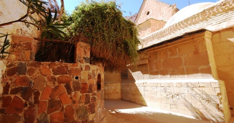 À l’intérieur des murs du monastère, il y a une petite mosquée datant de la période fatimide, appelée Mosquée Al-Hakim ‘’Masjid al-Ḥākim bi Amr Allāh ». Elle a été construite en adobe et en pierre de granit en 1106 après JC, à 10 mètres de la Grande Église. Une petite église a également été construite sur le mont Moïse, une presse pour extraire l’huile des olives, un ancien magasin d’alimentation et un puits d’eau, en plus d’un un groupe de jardins d’arbres et de fleurs du côté nord-ouest à l’extérieur du mur.