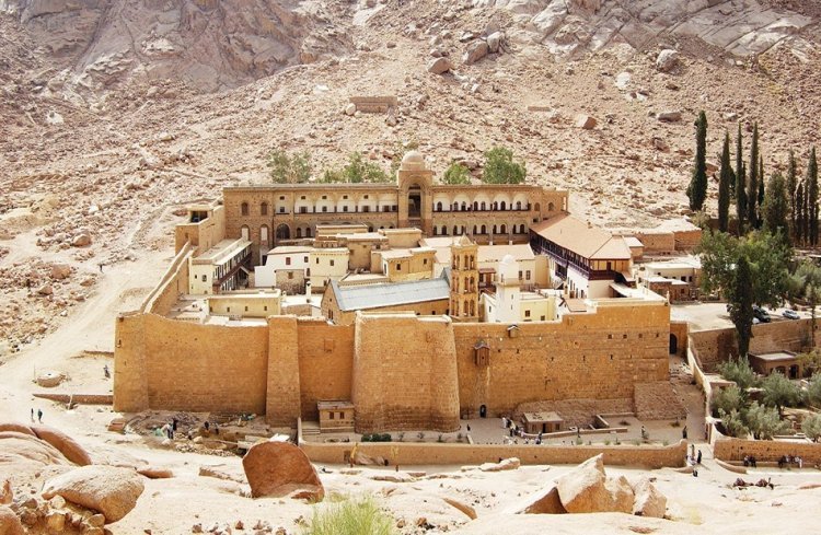 Il a été attribué à la sainte Catherine, grâce à elle, 50 savants ont cru, et l’empereur a ordonné qu’elle soit torturée et tuée par décapitation. Ses noms étaient nombreux avant qu’il lui soit attribué, car il était censé s’appeler le nom de le Prophète de Dieu Moïse – que la paix soit sur lui – comme il a parlé à son Seigneur dans cette région, sauf qu’il a pris le nom de « Transfiguration ». Ensuite, il s’appelait le Monastère de la Vierge Mariam et c’est l’un des plus anciens monastères du monde. Il est bordé par Wadi al-Raha à l’ouest. Il se compose de plusieurs bâtiments entourés d’un immense mur de granit avec quatre tours dans ses coins. Sa hauteur compris entre 12 et 15 mètres, et la longueur de ses côtés atteint 117/ 80 / 77 / 76 mètres, et habité par des moines de l’Église orthodoxe grecque. Il se distingue que le monastère n’a pas été détruit dans toute son histoire et a conservé les caractéristiques distinctives de son héritage grec et romain, et les bâtiments les plus importants du monastère :