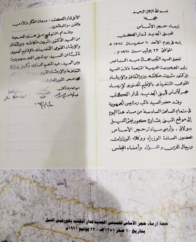 Mnamo mwaka wa 1959, Tharwat Okasha, Waziri wa Utamaduni na Mwongozo na Mwenyekiti wa Baraza Kuu la maktaba ya vitabu "Dar al-Kutub", aliombea ufadhili wa jengo jipya kutoka kwa robo ya ruzuku iliyotengwa kwa maktaba hiyo. Ilichaguliwa ardhi mbele ya eneo la Bulaq kwenye kornish ya Nile, inayoitwa "Ramlet Bulaq," na ilitengwa kwa "Dar al-Kutuba" maktaba hiyo ya Misri, vituo vyake vya kisayansi, na uchapishaji iliyoambatanishwa.